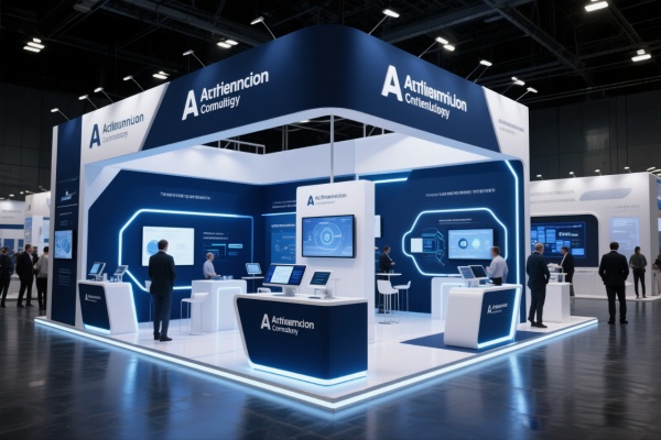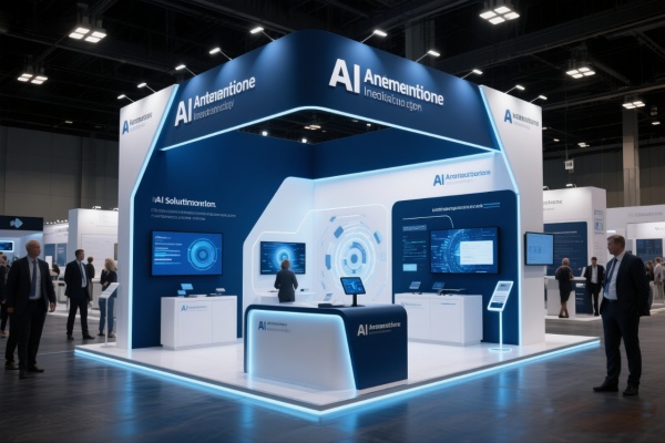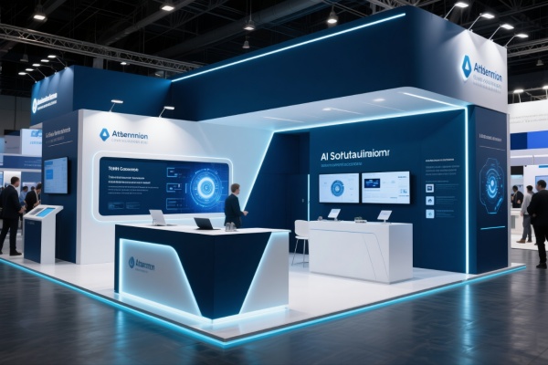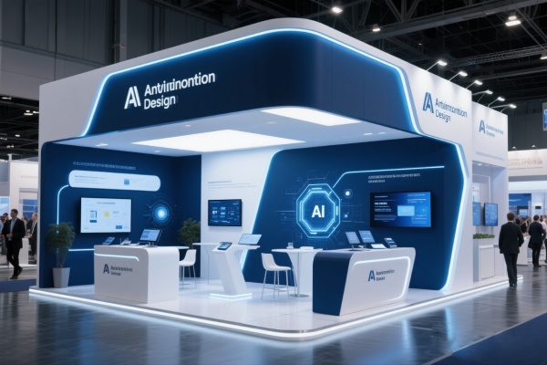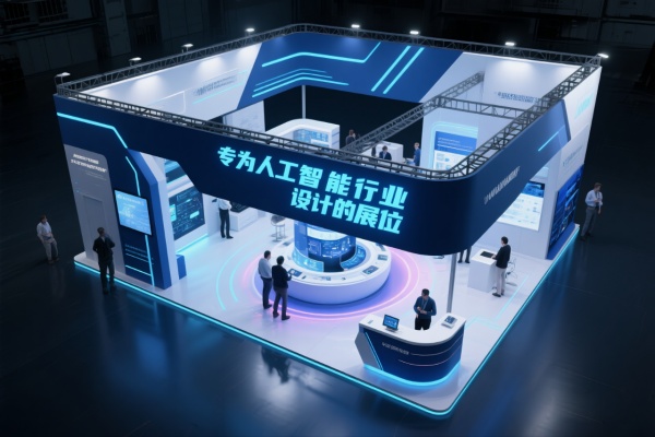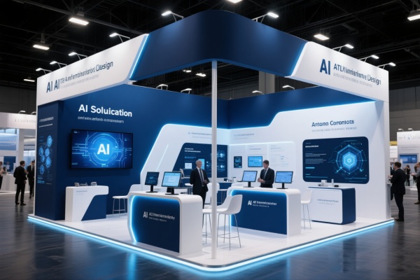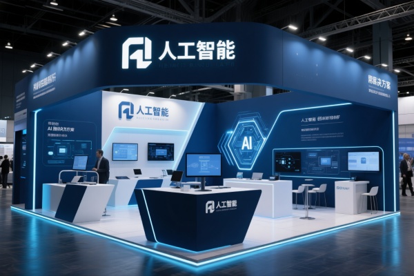 人工智能行業設計的展位,采用深藍和白色,傳遞出科技與創新的形象,展位布局功能性強,設有技術演示區和咨詢臺,幫助觀眾了解AI解決方案,使用高科技材料和動態燈光,增強展位的現代感,適合人工智能公司的展示。