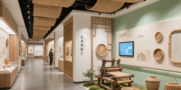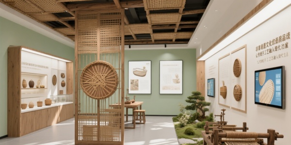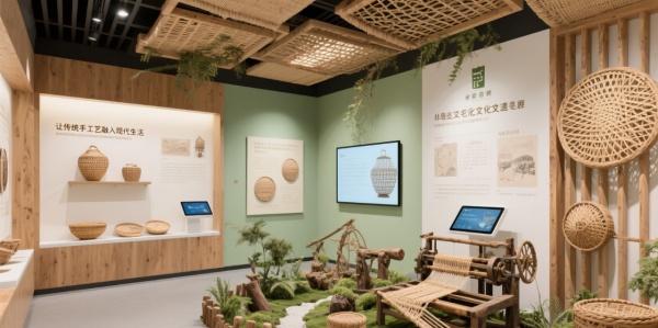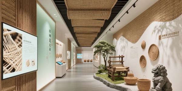 色彩運用主色調:原木色(自然與溫暖) + 米白(簡約優雅);漸變效果:淡綠色墻面,展示藤編的自然氣息。設計元素材質:老藤材(歷史感)、天然纖維(工藝載體)、互動屏(展示藤編過程);符號提煉:將藤編的紋路放大,作為空間隔斷。場景化模塊文化長廊:光影展示藤編歷史,觸控屏提供詳細信息;體驗區:提供仿古編織機,讓觀眾親自體驗;產品展示區:微型藤編園景觀,展示藤編藝術與自然的結合。