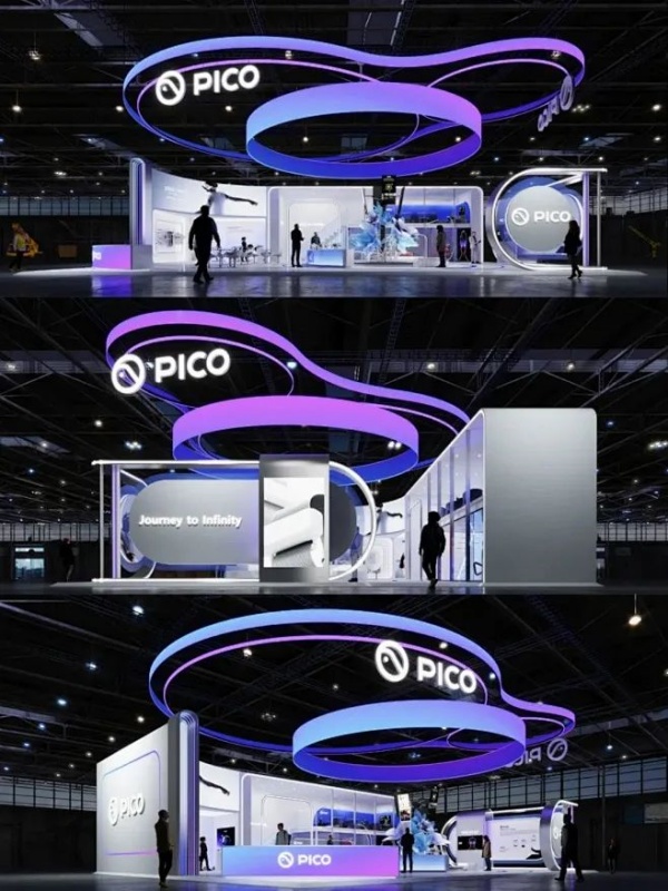 展位以“PICO - Journey to Infinity”為主題,旨在通過極簡主義的設計語言與未來科技感相結合,打造一個沉浸式的體驗空間。設計靈感來源于“無限(Infinity)”的概念,象征PICO品牌在虛擬現實(VR)領域的無限探索與創新。展位通過簡潔的視覺元素、動態光影效果和互動技術,引導觀眾步入一場跨越現實與虛擬的旅程。