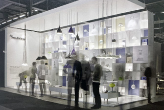 本項(xiàng)目是傳統(tǒng)公司在斯德哥爾摩家具展上的展廳。相比較而言,此展廳長(zhǎng)而窄,很明顯只能在垂直方向上做文章。眾多格子頗有韻律地堆砌在一起,顯得俏皮而嚴(yán)肅,這正符合品牌的定位。展廳前后的顏色與&傳統(tǒng)的商標(biāo)一致,公司設(shè)計(jì)師的大理石半身像被印成圖片掛在前面。展品與多維度的貨架完美地結(jié)合在一起,給人一種比例扭曲的感覺(jué)。形態(tài)各異的吊燈自天花板垂下,一起構(gòu)成一襲透明的窗簾。