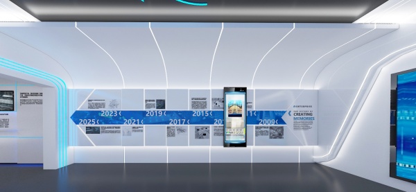 本次展館設計色彩是以海洋藍、暖白為主要搭配色,力求表現企業整體形象,既體現時代感,又能突出企業特色,將企業文化理念融合其中,貫穿于整個展廳,在展示企業形象的同時,感受精神層次的內涵。